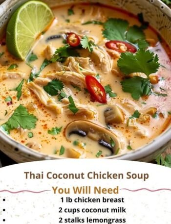 🍲 Description This comforting Thai soup blends creamy coconut milk with tangy lime, savory chicken, and fragrant herbs like lemongrass …
