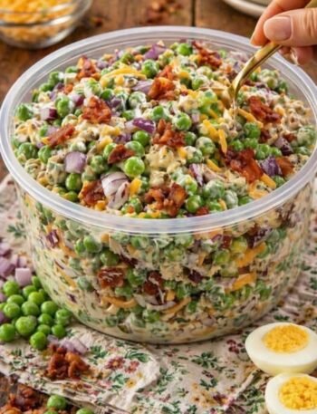 🧾 Description This salad combines sweet green peas, crispy bacon, sharp cheddar cheese, and zesty red onions, all coated in …