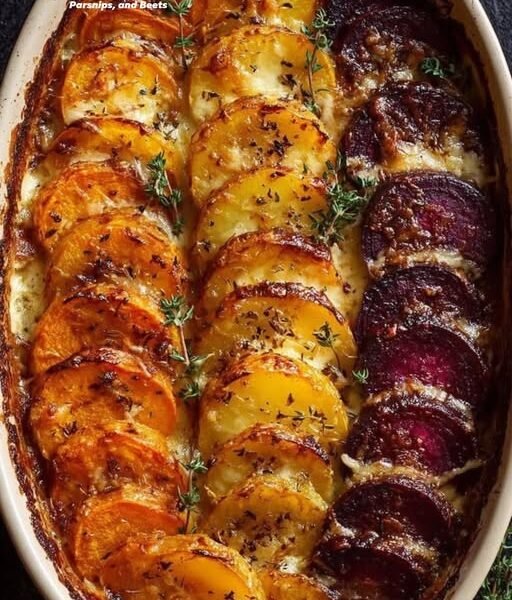 This gratin layers thin slices of sweet potatoes, parsnips, and beets in a creamy, garlicky sauce, then bakes until tender with a golden, bubbly top. It’s rustic, elegant, and full of natural sweetness.