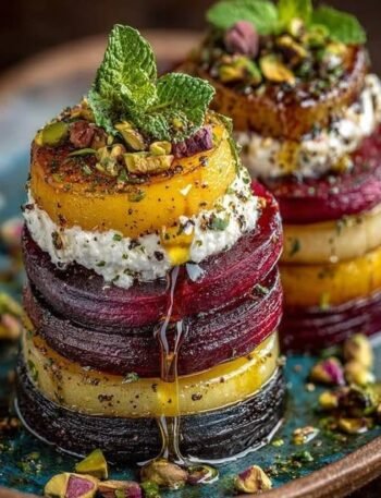 ✨ Caramelized Beet & Pear Towers with Feta Snow & Citrus Honey Drip Mediterranean • Vegetarian • 25 minutes • …
