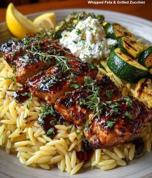 🍗 Balsamic Glazed Chicken & Orzo with Whipped Feta & Grilled Zucchini