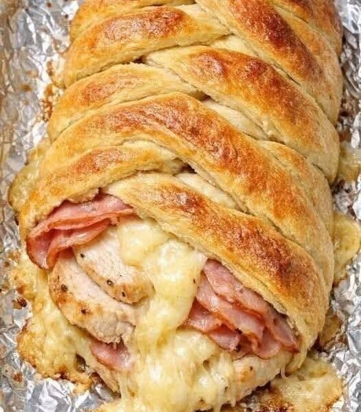 In a bowl, mix chicken, ham, mozzarella cheese, cream cheese, garlic powder, salt, and pepper. This mixture should be rich, cheesy, and slightly sticky.