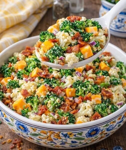 This salad combines crisp-tender broccoli, finely chopped cauliflower (or cauliflower “rice”), smoky bacon, sharp cheddar cheese cubes, and red onion, all tossed in a creamy, slightly tangy dressing. It’s a satisfying mix of textures—crunchy, creamy, and savory—and works great as a keto-friendly, gluten-free, or low-carb recipe. The richness of the bacon and cheese balances beautifully with the freshness of the vegetables.