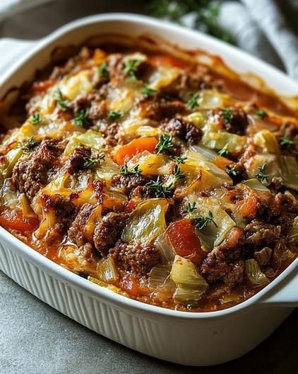 A hearty, budget-friendly casserole made with tender cabbage, seasoned ground beef, and a rich tomato sauce baked together with melted cheese. It’s comforting, filling, and perfect for family dinners or meal prep.