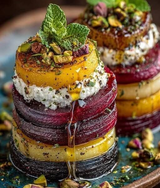 ✨ Caramelized Beet & Pear Towers with Feta Snow & Citrus Honey Drip