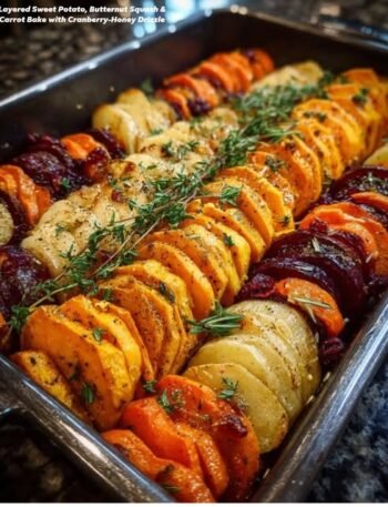 🍠🥕 Layered Sweet Potato, Butternut Squash & Carrot Bake with Cranberry–Honey Drizzle (Mediterranean) Serves: 6 Prep Time: 20 minutes Bake …