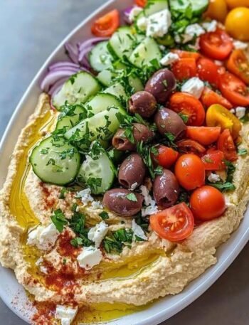 Loaded Mediterranean Hummus Platter A fresh, vibrant, and delicious Mediterranean-style appetizer topped with veggies, olives, feta, herbs, and olive oil. …