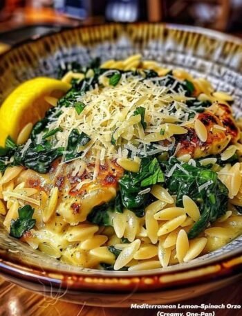 Description This dish is a vibrant Mediterranean-inspired comfort meal combining tender, golden-seared chicken with creamy lemon-infused orzo pasta, fresh spinach, …
