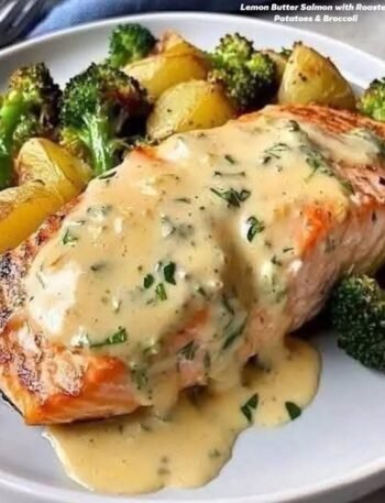 🍋🧈 Lemon Butter Salmon with Roasted Potatoes & Broccoli ✨ Description A wholesome, Mediterranean-inspired sheet-pan meal featuring tender, flaky salmon …