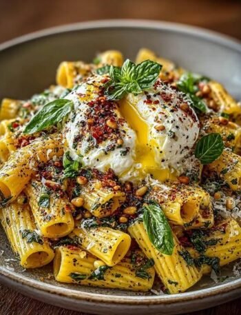 🍋 Lemon Basil Rigatoni with Burrata & Roasted Pine Nuts ✨ Description This dish combines al dente rigatoni tossed in …