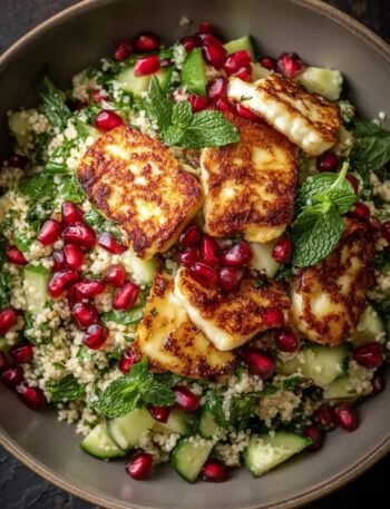 🥗 Crispy Halloumi Couscous Salad with Pomegranate & Mint 📝 Description A vibrant, refreshing salad featuring fluffy couscous tossed with …