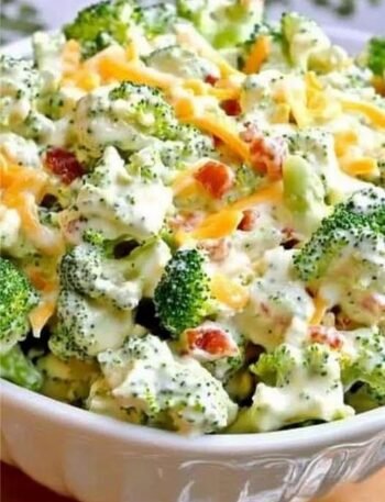 📝 Description This classic broccoli salad combines crisp broccoli florets with a rich, tangy dressing, sharp cheddar cheese, and savory …