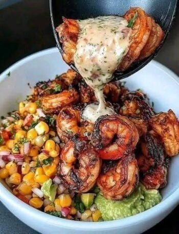 🍤 Grilled Shrimp Bowl with Avocado, Corn Salsa & Creamy Sauce Fresh • Protein-Packed • Mediterranean Style ✨ Description This …