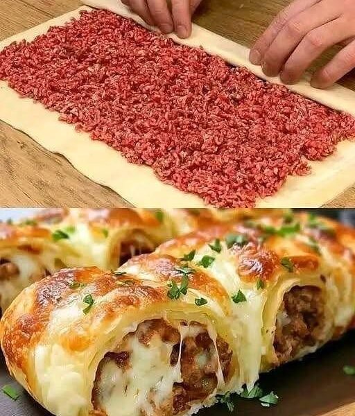 Spread beef mixture evenly over dough, leaving a small border. Sprinkle cheese on top. Roll tightly into a log and pinch edges to seal.