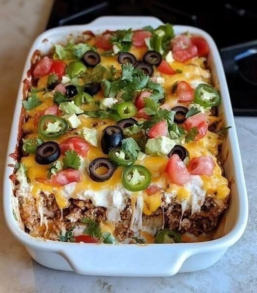 This cheesy Mexican taco casserole is a family-friendly dinner recipe that combines bold Tex-Mex flavors with the comfort of a baked pasta dish. Instead of noodles, soft tortillas create delicious layers between seasoned ground beef, rich enchilada sauce, and gooey melted cheddar and Monterey Jack cheese. After baking, it’s topped with fresh pico de gallo, sliced black olives, jalapeños, and cilantro for a vibrant finish.