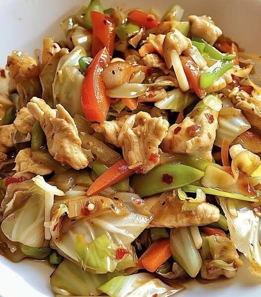 Tender chicken strips are quickly stir-fried with crisp cabbage, garlic, and ginger in a glossy soy-based sauce. This version keeps things lighter by using olive oil instead of heavy oils and balancing the flavors with a touch of lemon and herbs—ready in under 30 minutes and perfect for a healthy dinner.