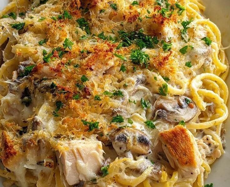 Chicken Tetrazzini is a classic baked pasta casserole traditionally made with chicken, mushrooms, cream sauce, and cheese.
