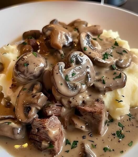 This savory beef tips and mushroom gravy recipe combines seared chunks of tender beef simmered in a rich, homemade brown gravy with garlic, butter, herbs, and earthy mushrooms. Served over fluffy, buttery mashed potatoes, it delivers deep flavor, comforting texture, and an elegant presentation.