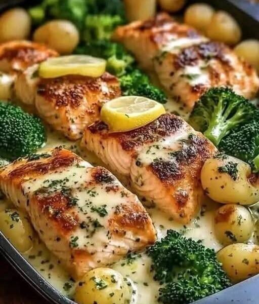 This creamy garlic butter salmon is a restaurant-quality dinner made in one pan, featuring perfectly seared salmon fillets, tender baby potatoes, and fresh broccoli in a rich garlic parmesan cream sauce. It’s ideal for those searching for healthy dinner recipes, high-protein meals, low-carb recipes, keto-friendly dinners, and Mediterranean diet meal ideas.