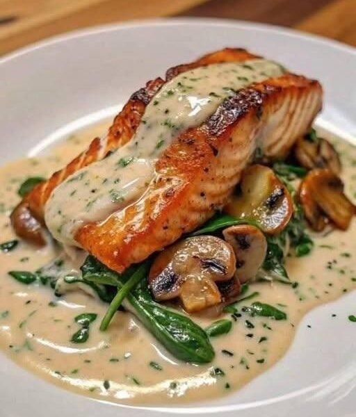 🐟 Mediterranean Creamy Garlic Butter Salmon with Spinach & Mushrooms
