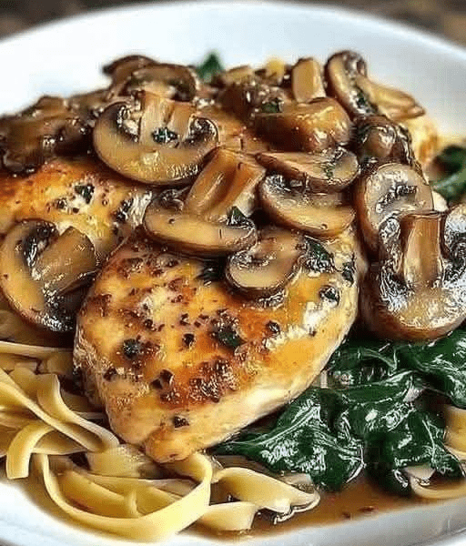 This Creamy Garlic Mushroom Chicken is a restaurant-quality comfort food recipe made right at home. Juicy pan-seared chicken breasts are smothered in a rich garlic mushroom sauce and served over tender pasta with sautéed spinach. It’s the perfect high-protein dinner recipe, ideal for family meals, date nights, or even meal prep.