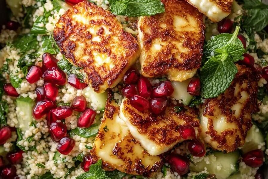 A vibrant, refreshing salad featuring fluffy couscous tossed with crisp cucumber, fresh herbs, and bursts of sweet-tart pomegranate, topped with golden, pan-seared halloumi cheese. It’s light yet satisfying—perfect as a main or a stunning side dish.