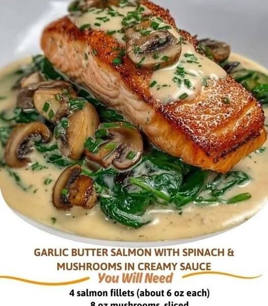 Tender salmon fillets are pan-seared in garlic and olive oil, then nestled into a light, creamy sauce with sautéed mushrooms and fresh spinach. Finished with lemon and herbs, this Mediterranean-inspired dish is rich yet balanced—perfect with rice, pasta, or low-carb sides.