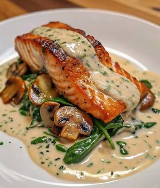 🐟 Garlic Butter Salmon with Spinach & Mushrooms in Creamy Mediterranean Sauce