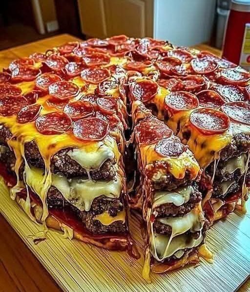 This is a huge, loaded, double-layer cheeseburger-style pizza that tastes like a mashup of a classic burger and a meat-lovers pizza. Perfect for parties or serious comfort food nights.