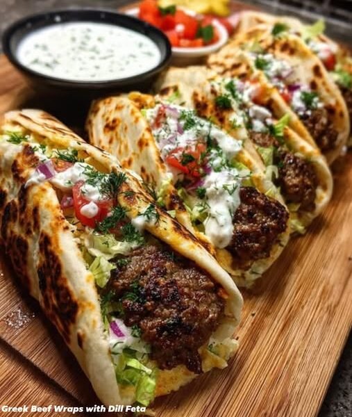 These Greek Beef Wraps with Dill Feta Sauce are a Mediterranean-inspired, high-protein meal packed with bold flavors and anti-inflammatory ingredients. Juicy seasoned beef is wrapped in warm flatbread and topped with crisp vegetables and a creamy dill feta yogurt sauce.
