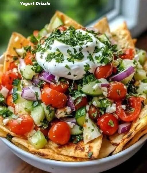 A Mediterranean twist on classic nachos inspired by the vibrant flavors of Greece. Crispy baked pita chips are layered with fresh vegetables, olives, and feta, then finished with a cool, garlicky yogurt drizzle. Perfect as an appetizer, mezze platter addition, or light dinner.