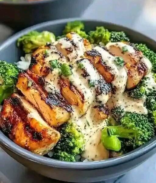 This high-protein chicken bowl recipe combines juicy grilled chicken breast, steamed broccoli, fluffy rice, and a rich homemade garlic parmesan cream sauce. It’s a balanced meal packed with lean protein, fiber, and healthy carbs — ideal for weight loss meal prep, muscle gain diets, and healthy dinner recipes for busy weeknights.