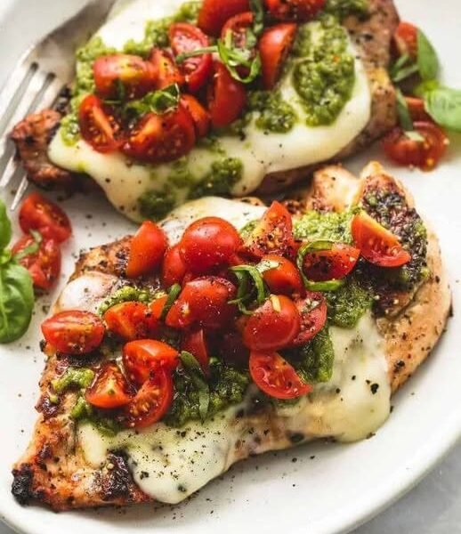 In the last 2 minutes of grilling, place a slice of mozzarella on each chicken breast.