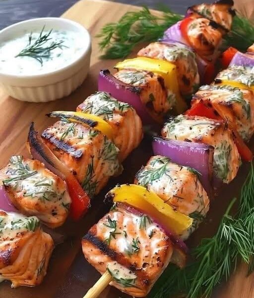 🐟 Grilled Salmon Skewers with Creamy Dill Yogurt Sauce (Mediterranean Style)
