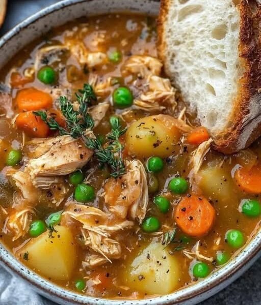 There are few dishes as universally comforting as a warm bowl of hearty chicken and vegetable stew. Rich, savory broth. Tender shredded chicken. Soft potatoes, sweet carrots, and bursts of green peas — all simmered together into a deeply satisfying meal that feels like a hug in a bowl.