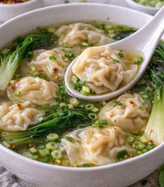 This comforting soup features delicate wontons filled with seasoned meat, floating in a fragrant broth infused with ginger, garlic, and soy sauce. It’s light yet satisfying—perfect for a quick dinner or a soothing meal.