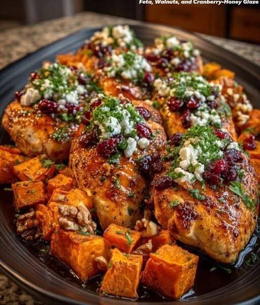 Honey Garlic Chicken with Sweet Potatoes, Feta, Walnuts, and Cranberry Honey Glaze