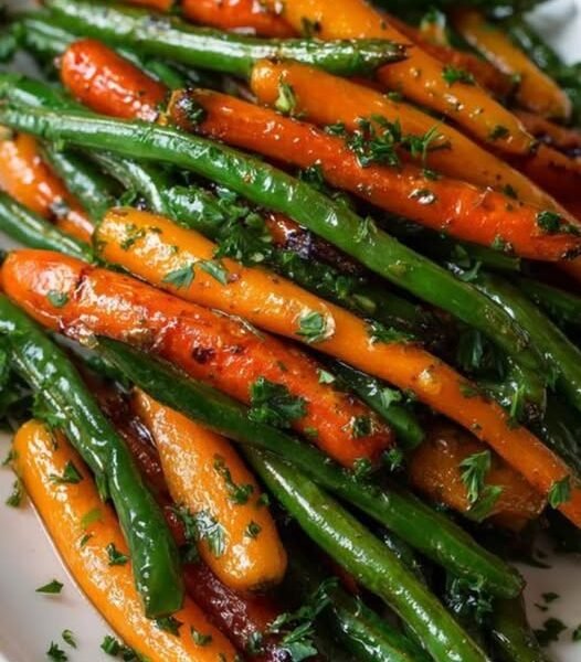 Tender-crisp carrots and fresh green beans are lightly sautéed and coated in a buttery honey glaze with a hint of garlic. It’s bright, slightly sweet, and beautifully balanced.
