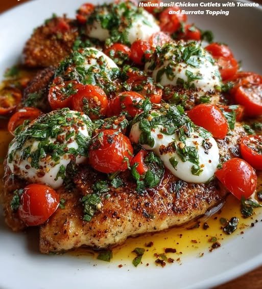 These Italian basil chicken cutlets are lightly breaded, pan-fried until golden, then topped with juicy sautéed tomatoes, fresh basil, and luscious burrata cheese. The warm tomatoes gently melt the burrata, creating a creamy, luxurious finish without heaviness. It’s simple, elegant, and packed with Mediterranean flavor—perfect for both weeknights and entertaining.