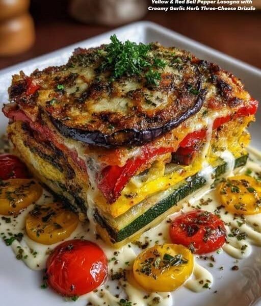 This layered Mediterranean vegetable lasagna is a show-stopping vegetarian main that eats like comfort food but feels fresh, colorful, and nourishing. Instead of pasta sheets, tender roasted eggplant and zucchini create naturally gluten-free layers, while sweet bell peppers, tomatoes, and herbs bring classic Mediterranean flavor. The whole dish is finished with a creamy garlic herb three-cheese drizzle that melts into the vegetables and ties everything together.