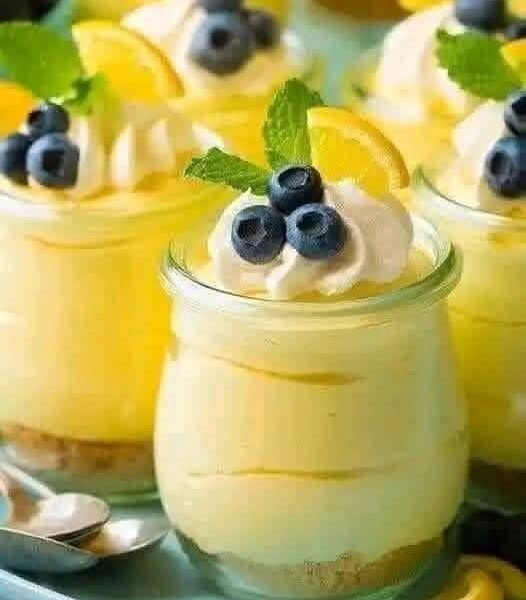 The bright citrus flavor balances perfectly with the rich cheesecake cream and juicy blueberries. The texture is light, airy, and luxurious — a gourmet-style dessert that looks impressive but is incredibly easy to make at home.
