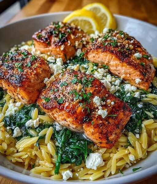 The salmon is seasoned simply and cooked until golden and flaky, allowing its natural richness to shine. Meanwhile, the orzo absorbs savory broth and lemony notes, creating a creamy texture without heavy cream. Fresh spinach adds color and nutrients, while feta provides a tangy contrast that balances the buttery sauce perfectly.