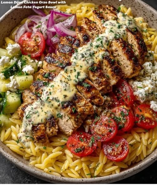 This Lemon Dijon Chicken Orzo Bowl with Lemon Feta Yogurt Sauce is a vibrant, Mediterranean-inspired meal that hits all the right notes: juicy grilled chicken, tender orzo pasta, fresh vegetables, and a creamy, tangy sauce that ties everything together. It’s bold without being heavy, comforting yet fresh, and perfect for anyone looking for a high-protein dinner, healthy weeknight meal, or meal prep–friendly lunch.