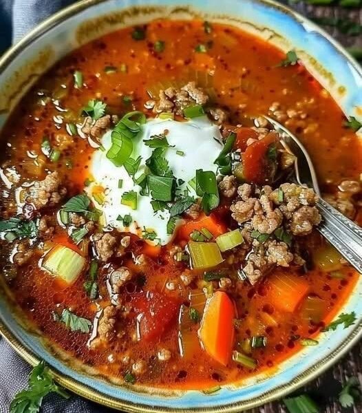 This hearty Mediterranean soup is warm, rustic, and deeply satisfying. Made with seasoned ground beef, tomatoes, carrots, celery, and aromatic spices, it simmers into a rich, comforting broth. A spoon of creamy yogurt on top adds brightness and balance—very common in Turkish and Eastern Mediterranean kitchens. Perfect for chilly evenings, meal prep, or when you want something nourishing and filling.