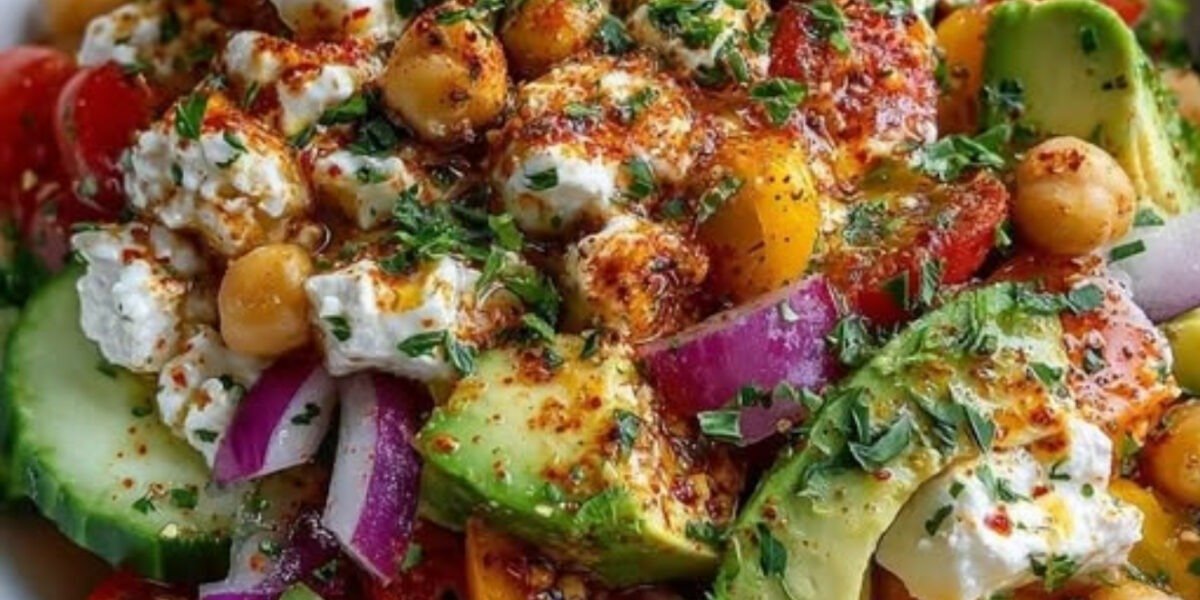 Visually, the salad is a feast for the eyes: crisp cucumber slices, juicy cherry tomatoes, creamy avocado, red onion, golden chickpeas, and soft cottage cheese, all finished with herbs and warm spices. Every bite delivers freshness, creaminess, crunch, and a satisfying savory depth.