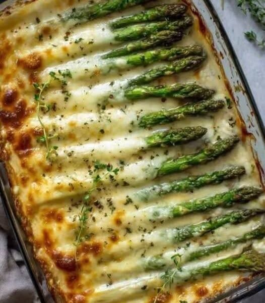 This dish looks like a creamy baked asparagus gratin — tender asparagus spears baked in a rich, cheesy béchamel-style sauce until golden and bubbly. It’s elegant, comforting, and very Mediterranean in flavor thanks to olive oil, fresh herbs, and simple wholesome ingredients.