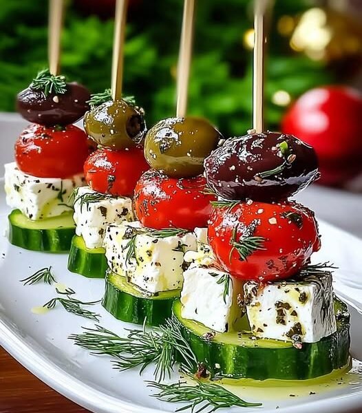Mediterranean Cucumber, Feta, Tomato & Olive Skewers