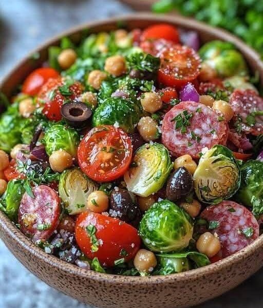 This salad combines the bold, savory flavors of Italy with the freshness of the Mediterranean. Crisp shaved Brussels sprouts and romaine lettuce form the base, balanced by juicy cherry tomatoes, briny olives, hearty chickpeas, and slices of salami for a touch of richness. Tossed with a light olive oil and lemon dressing (or your favorite Italian vinaigrette), it’s fresh, colorful, and satisfying—perfect as a side dish or even a light main.