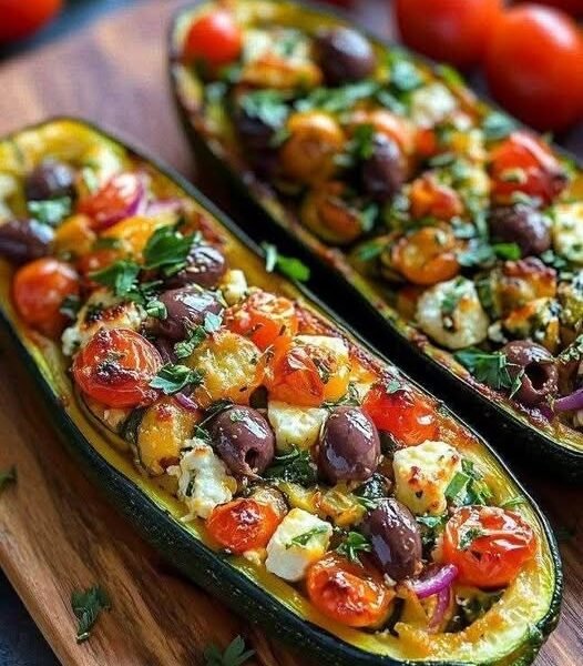 7. Spoon mixture into zucchini boats. Top with feta and mozzarella.