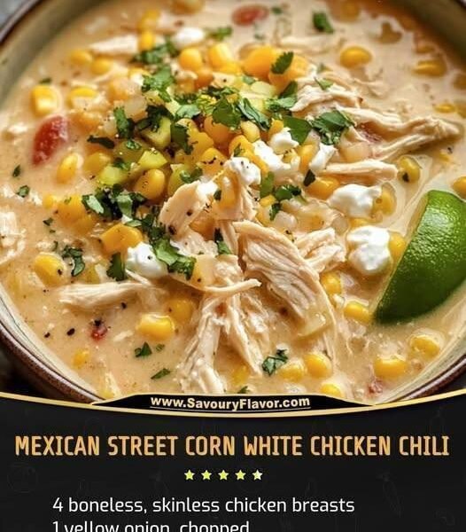 A creamy, comforting chili inspired by the bold flavors of Mexican street corn (elote). This dish combines tender chicken, sweet corn, white beans, and warm spices in a rich broth finished with lime, cheese, and fresh herbs. It’s hearty, flavorful, and perfect for a cozy dinner.